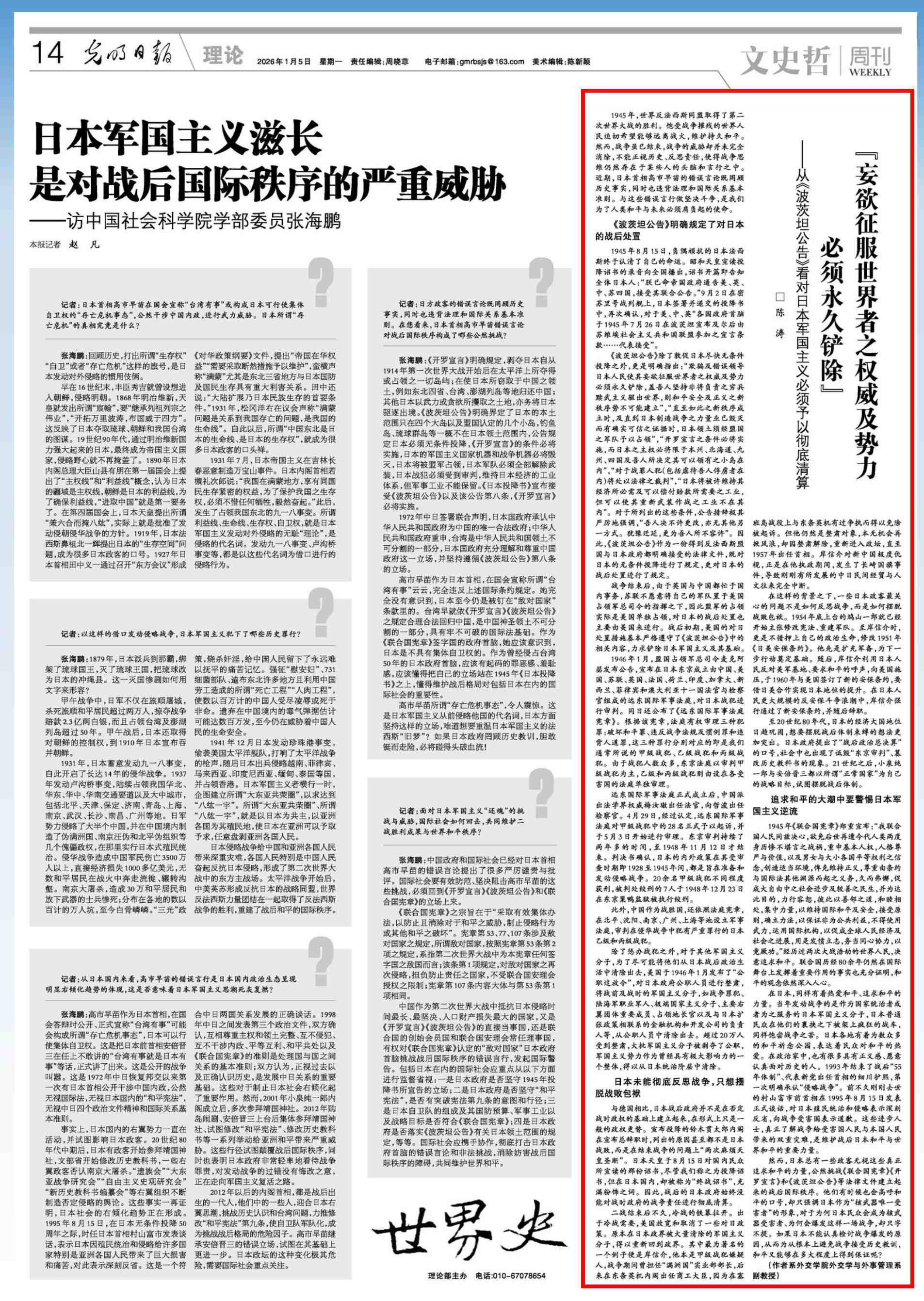 2026年1月5日,《光明日报》理论版刊发了我校外交学与外事管理系陈涛副教授撰写的文章《“妄欲征服世界者之权威及势力必须永久铲除”——从〈波茨坦公告〉看对日本军国主义必须予以彻底清算》,从历史与国际法的角度对近期日本一些政客的错误言论进行批驳。