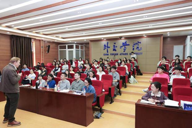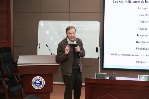 2025年4月23日下午,外语系于展览路校区419报告厅举办了“讲好中国故事,传播中国声音的经典翻译实践”讲座。本次讲座由中法翻译领域专家、“中国政府友谊奖”获得者戴维力(Jean Delvigne)主讲,外语系主任王晓侠教授主持,外交部派驻我系高级外交官石晓滢参赞全程参加讲座,来自北京第二外国语学院、我院外语系、国际经济学院等单位的师生共70余人参加了本次讲座。
